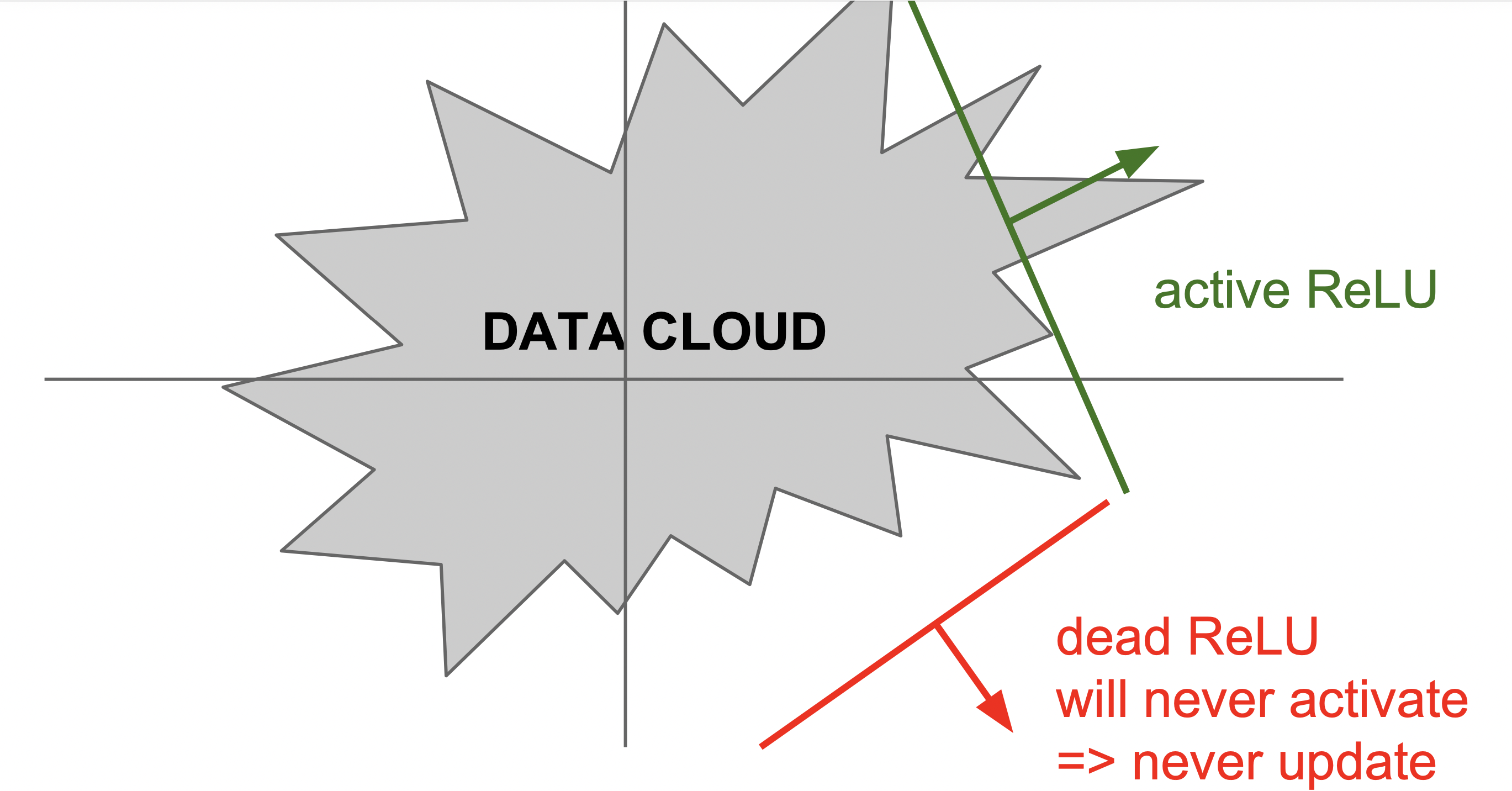 什么时候会 “挂掉” 呢?以此示意图解释,设上层 l-1 层输出值 \((o_1^{l-1}, o_2^{l-1},\cdots)\) 是二维空间的点,所有训练数据对应的点构成一片 data cloud。一个训练数据 l-1 层输出值 \(o^{l-1}\) 经过权重的线性组合得到 \(a_j^l\),要看它大于还是小于 0,就是看它在 cloud 中对应点落在直线的哪边(直线位置是权重决定的)。如果不巧直线正好落在 cloud 外,这样无论拿什么训练数据训练就都无法更新了,即 “挂掉” 永不更新。在参数更新的过程中,难免会不小心训练出这种不巧的权重(例如优化器不太稳定时,如学习率太高),而一旦发生这个意外,后果还是很严重的。