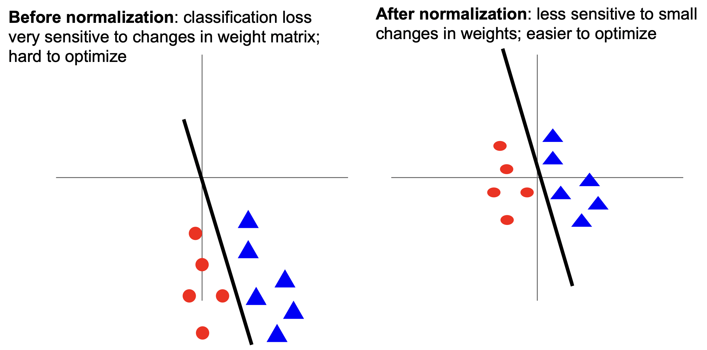 - 非零中心化的数据对模型权重的改变更加敏感,导致难以优化,见下图;