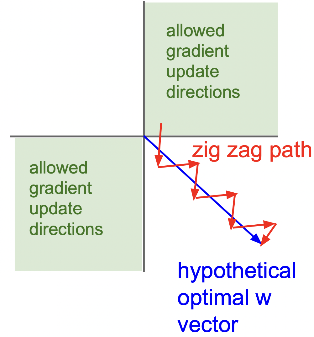 下图将这些权重画在二维空间中示意。由于梯度同号,权重更新时要么向右上、要么向左下(视 \(\delta_j^l\) 符号而定),要是最优解实际在起点的右下方时(高维空间更可能发生),就会发生图中所谓 zig-zag(锯齿)现象。