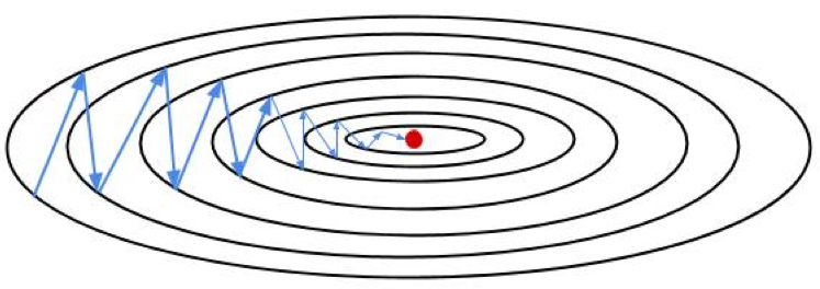 归一化作用:让数据的各个特征的值域范围统一起来,使损失函数更加倾向于圆润而不是狭长,有利于优化。狭长的损失函数也容易导致 zig-zag 现象,见下图,在学习率稍大时极容易 overshot。